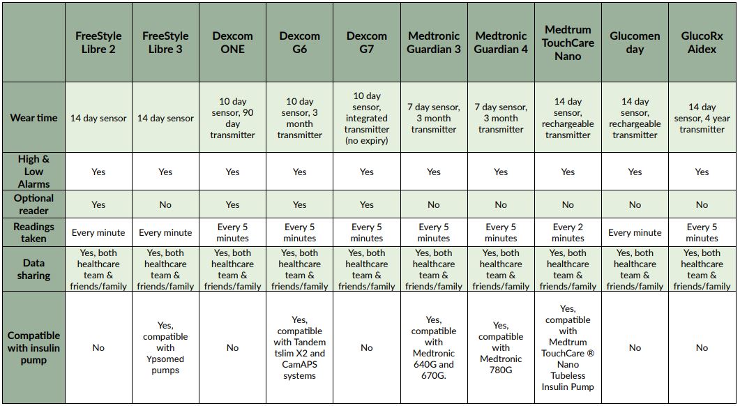 “The table below gives an overview of some of the most commonly used CGM’s used in the UK:”